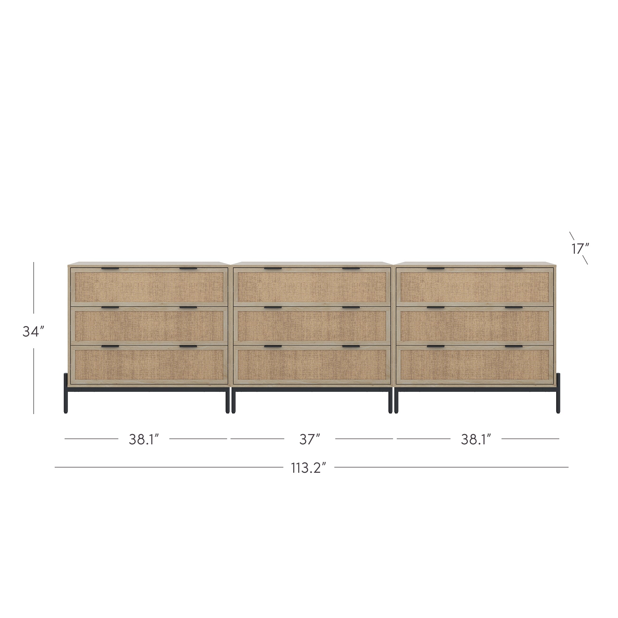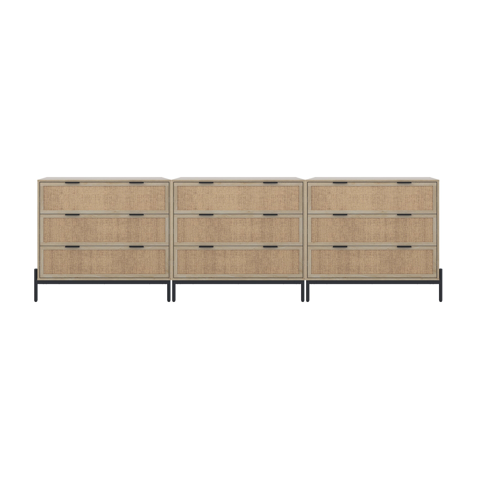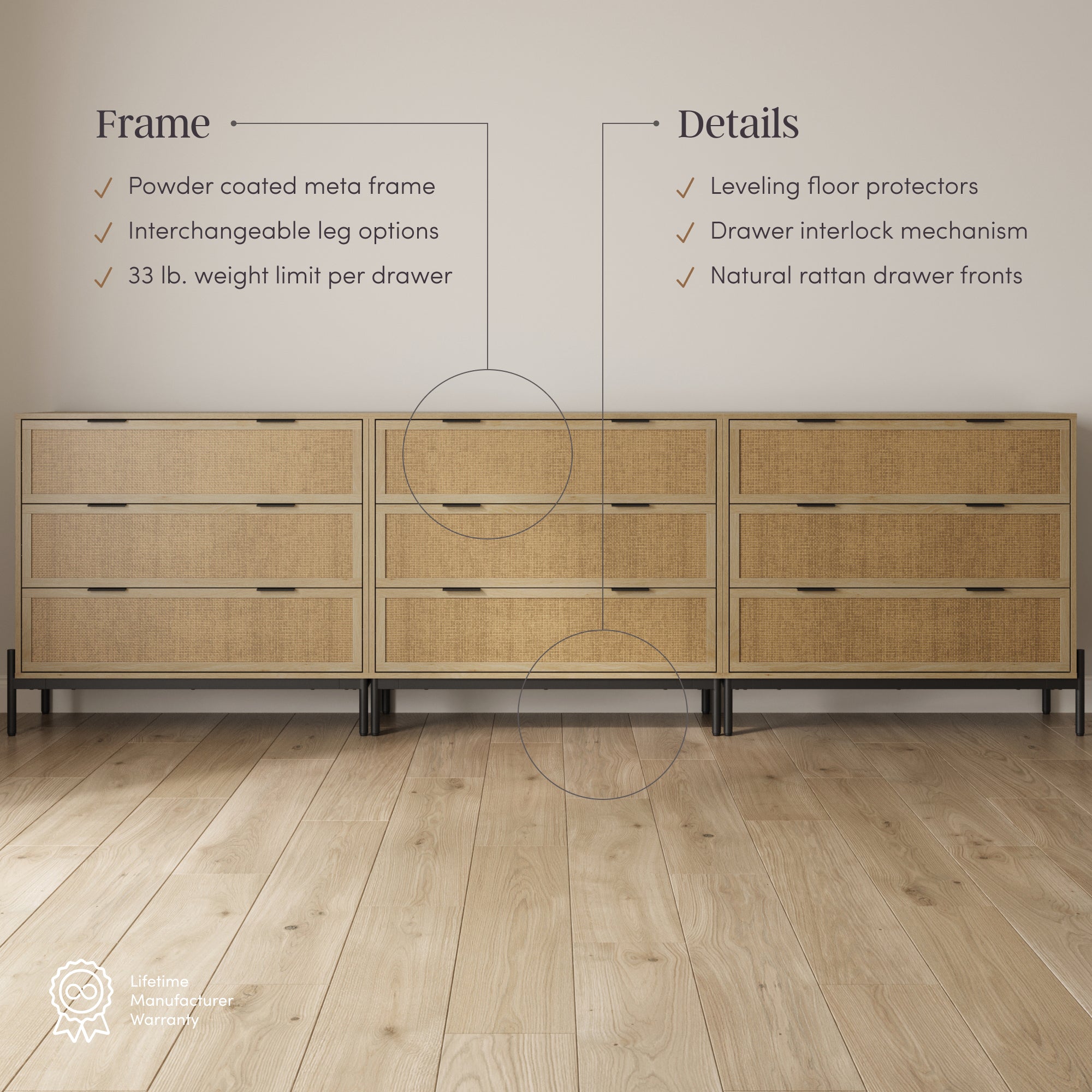 The Andrew 3-Pack Dresser in Light Oak brings effortless Boho style to your bedroom with its natural rattan drawer fronts and airy, organic texture. Each piece rests on a sleek powder-coated metal base with coordinating pulls and includes interchangeable leg options so multiple units can sit flush side-by-side. Three spacious drawers glide smoothly on metal slides with a built-in safety interlock system, and subtle variations in rattan color and texture make every set beautifully unique.