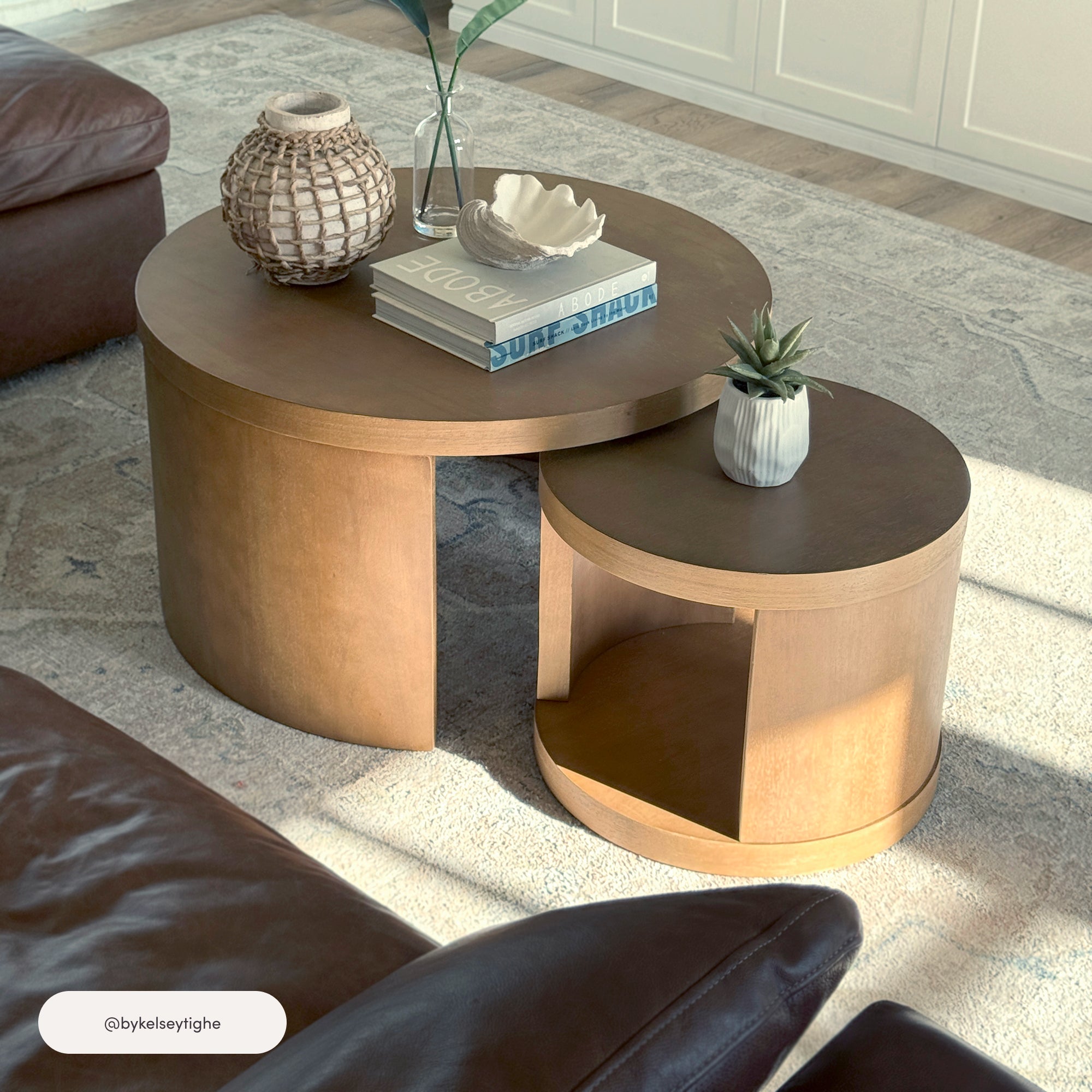 Meet your new favorite duo: the Uchu Nesting Coffee Tables. With thick tabletops and rich wood veneer, this stylish set brings warmth and charm to any space. The smaller table nests perfectly inside the larger one, giving you flexible function without sacrificing style. Built with sturdy construction and easy assembly in mind, It's as practical as it is pretty. And thanks to the natural wood grain, each piece is totally unique‚ no two tables are ever exactly alike