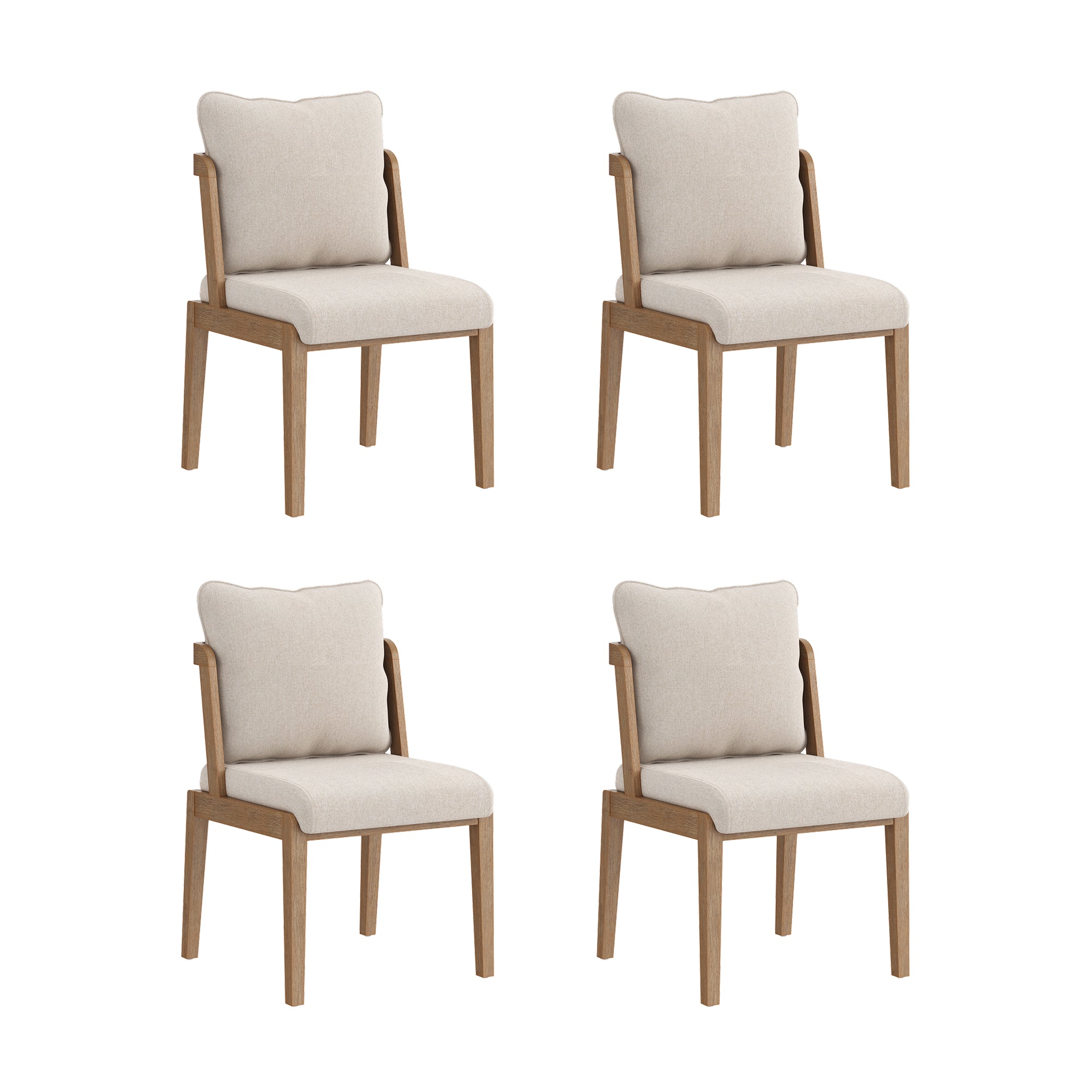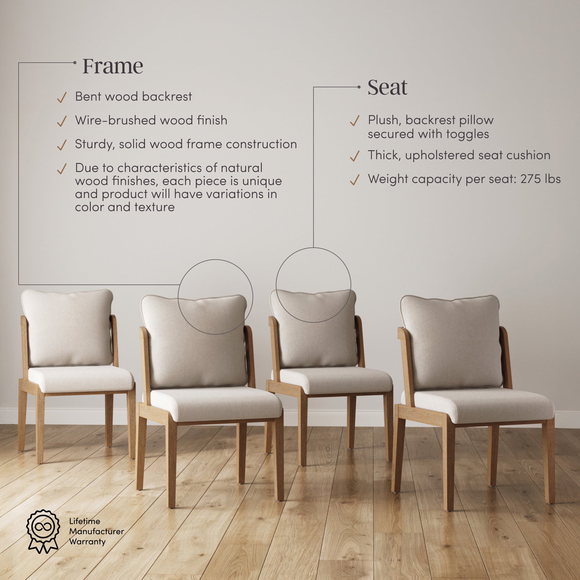 Bring comfort and character to your dining space with the Chuck Dining Chair set of 4. Designed with a plush backrest pillow secured by toggles and a thick upholstered seat cushion, it offers cozy support for everyday meals or gatherings. The bent wood backrest and wire-brushed wood finish add a touch of craftsmanship and warmth, while the sturdy solid wood frame ensures long-lasting durability. Each chair is one-of-a-kind, with natural variations in color and texture that highlight the beauty of real wood. And don’t worry—Chuck’s got your back (literally).