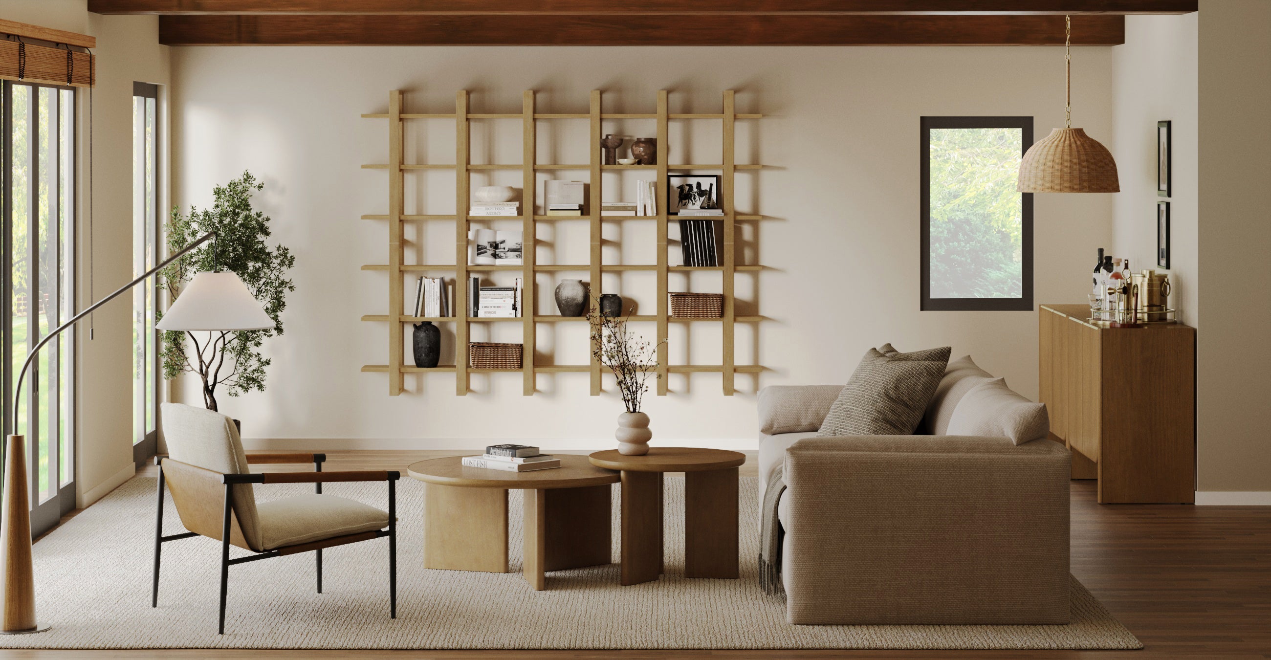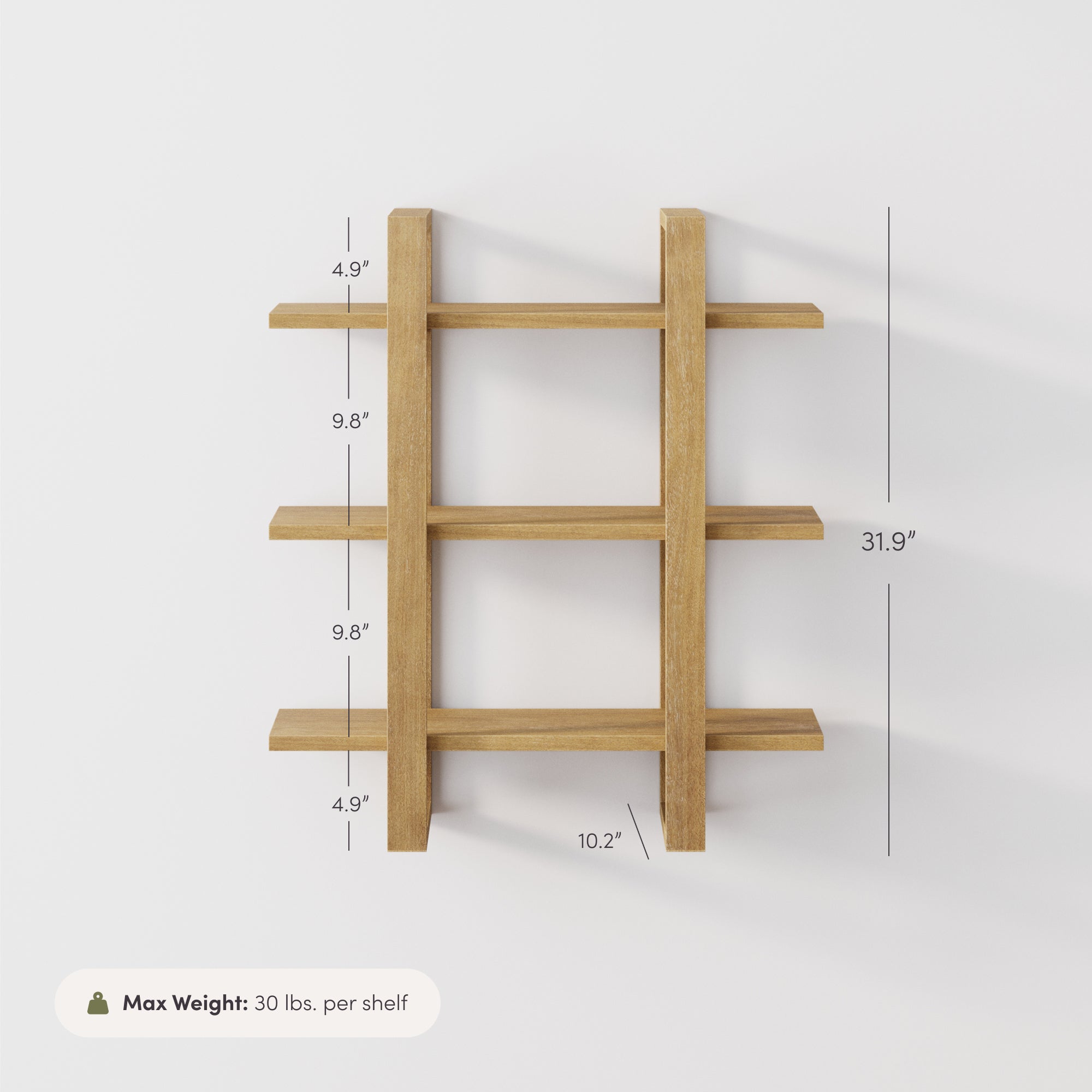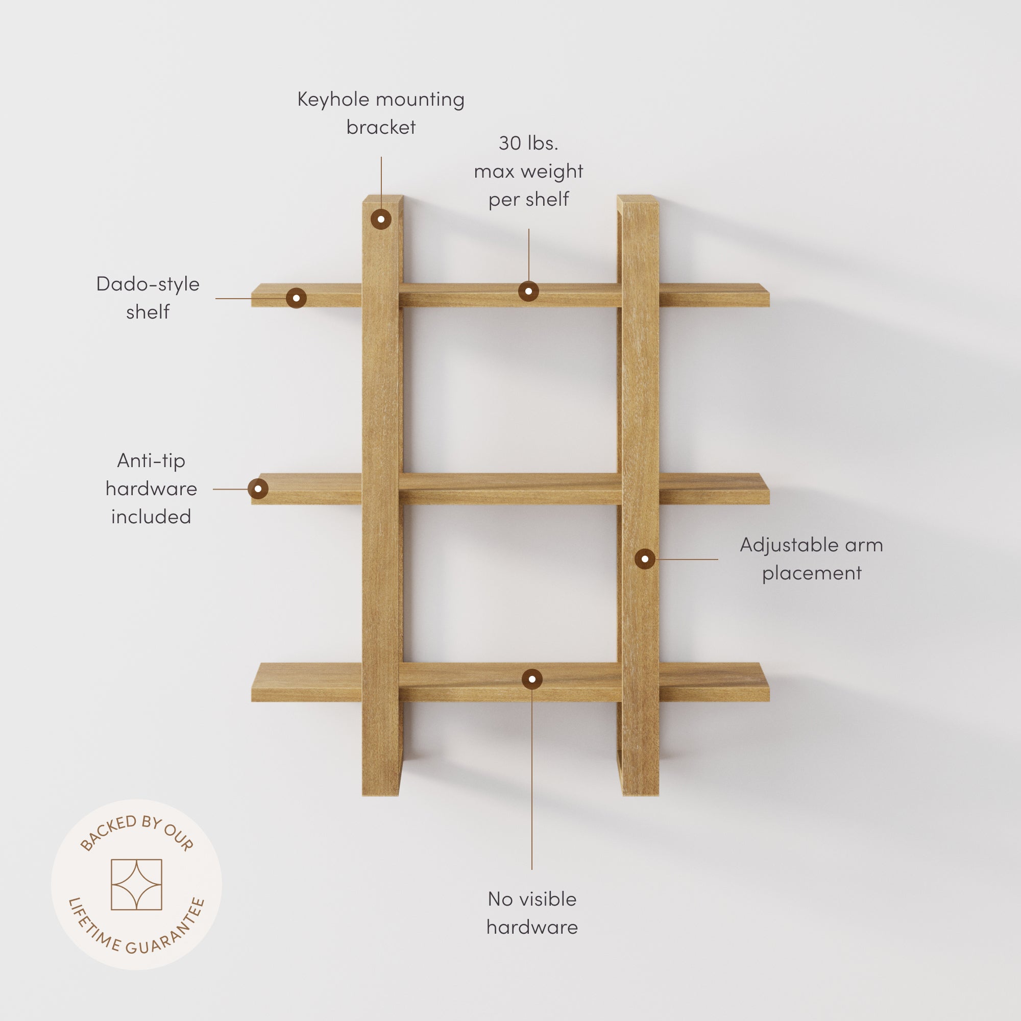 The Benji Wall Shelf brings mid-century modern simplicity to your walls with its warm light brown finish and clean, streamlined design. Crafted with dado-style joinery and no visible hardware, it offers a seamless, elevated look. Adjustable arms let you customize the layout, and you can mount it vertically or horizontally to fit your space. A keyhole mounting bracket and included anti-tip hardware ensure secure installation—style and function, thoughtfully built in.