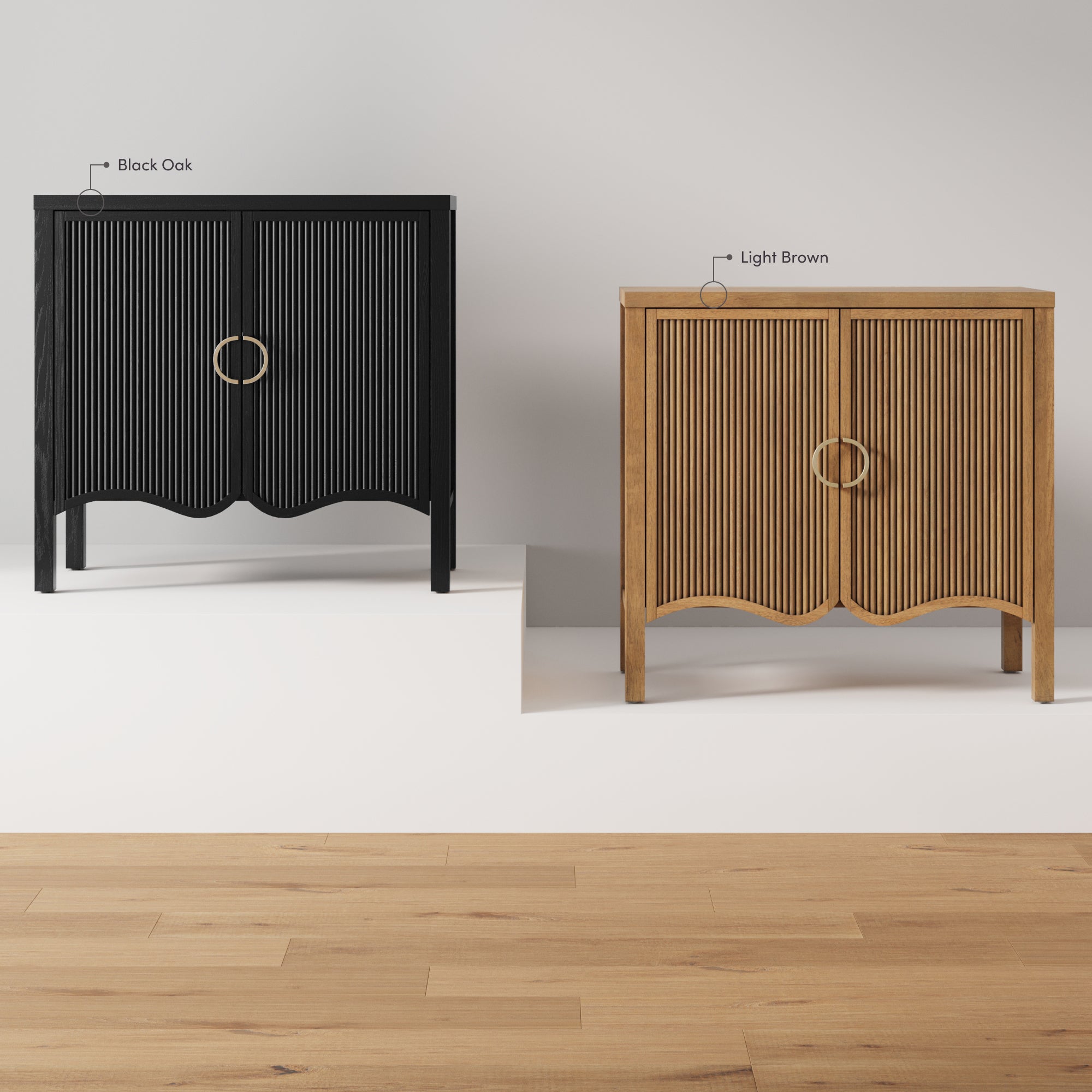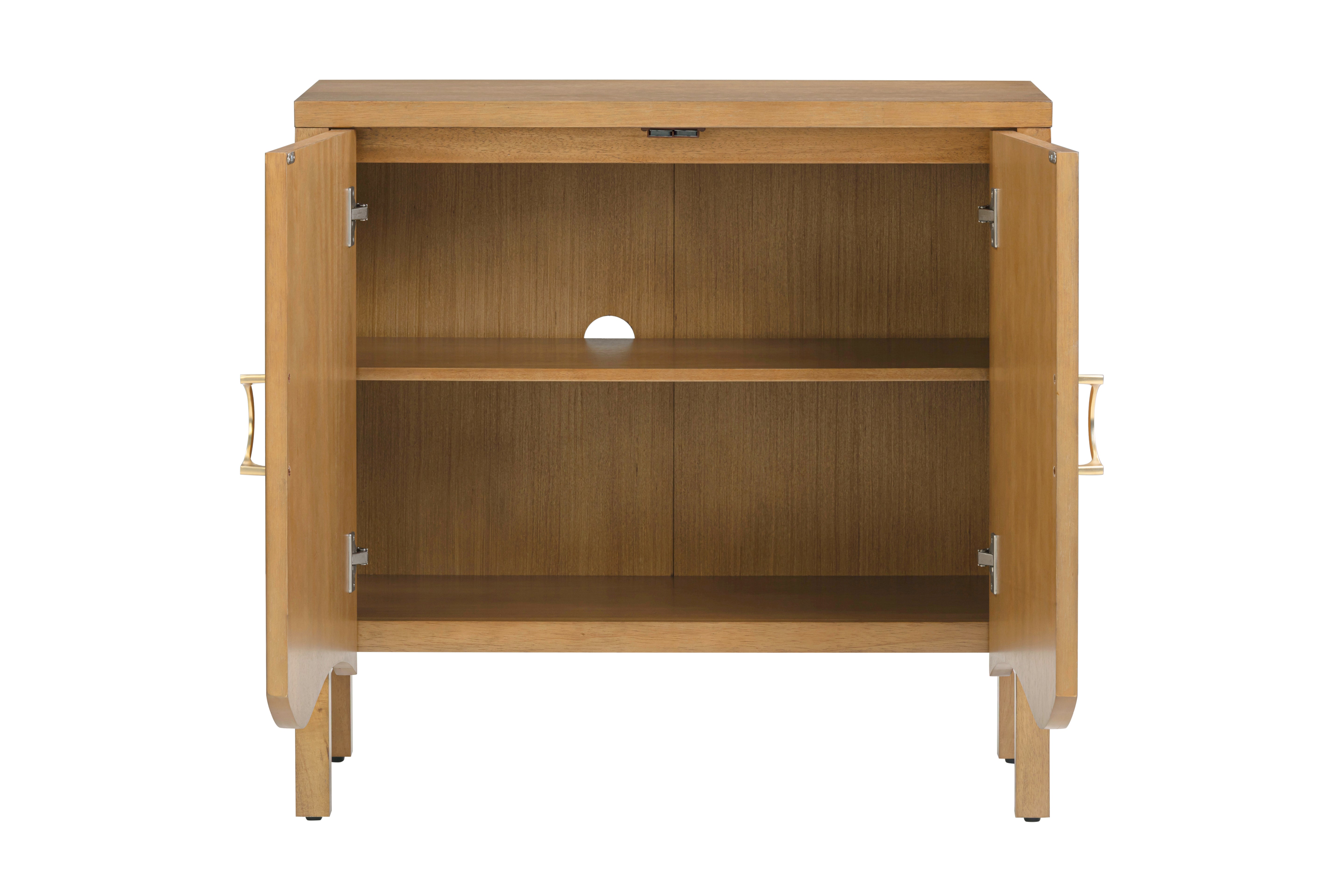 The Scott Storage Cabinet in light brown brings a warm, Transitional charm to your space. Its fluted doors feature a unique curved edge and circular pulls for an elegant, modern touch. Soft-close doors and cord access in the back add everyday convenience, while the solid wood leg frame ensures lasting durability. Finished in real wood veneer, each cabinet showcases one-of-a-kind variations in color and texture‚Äö and you can place multiple units side-by-side for a seamless look.