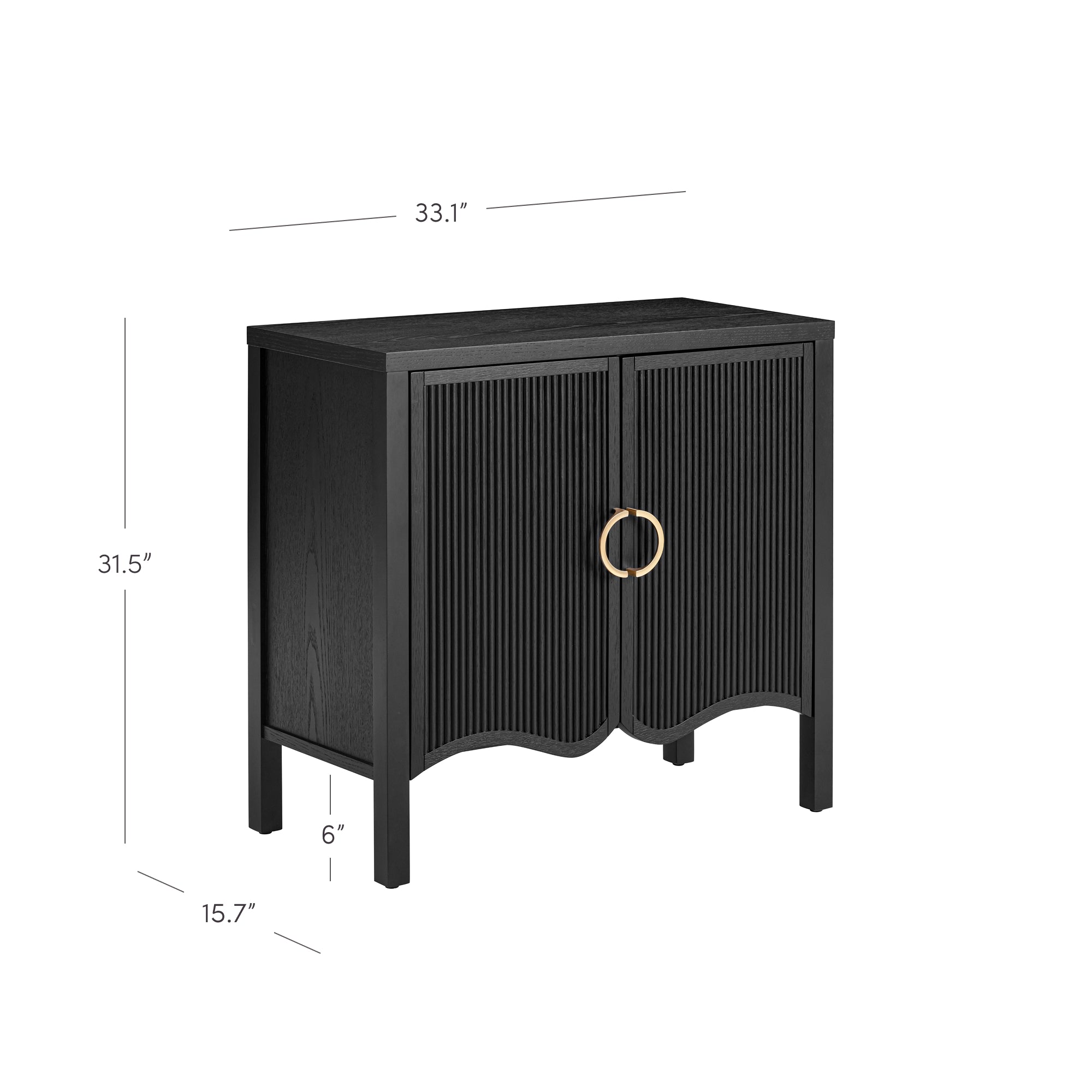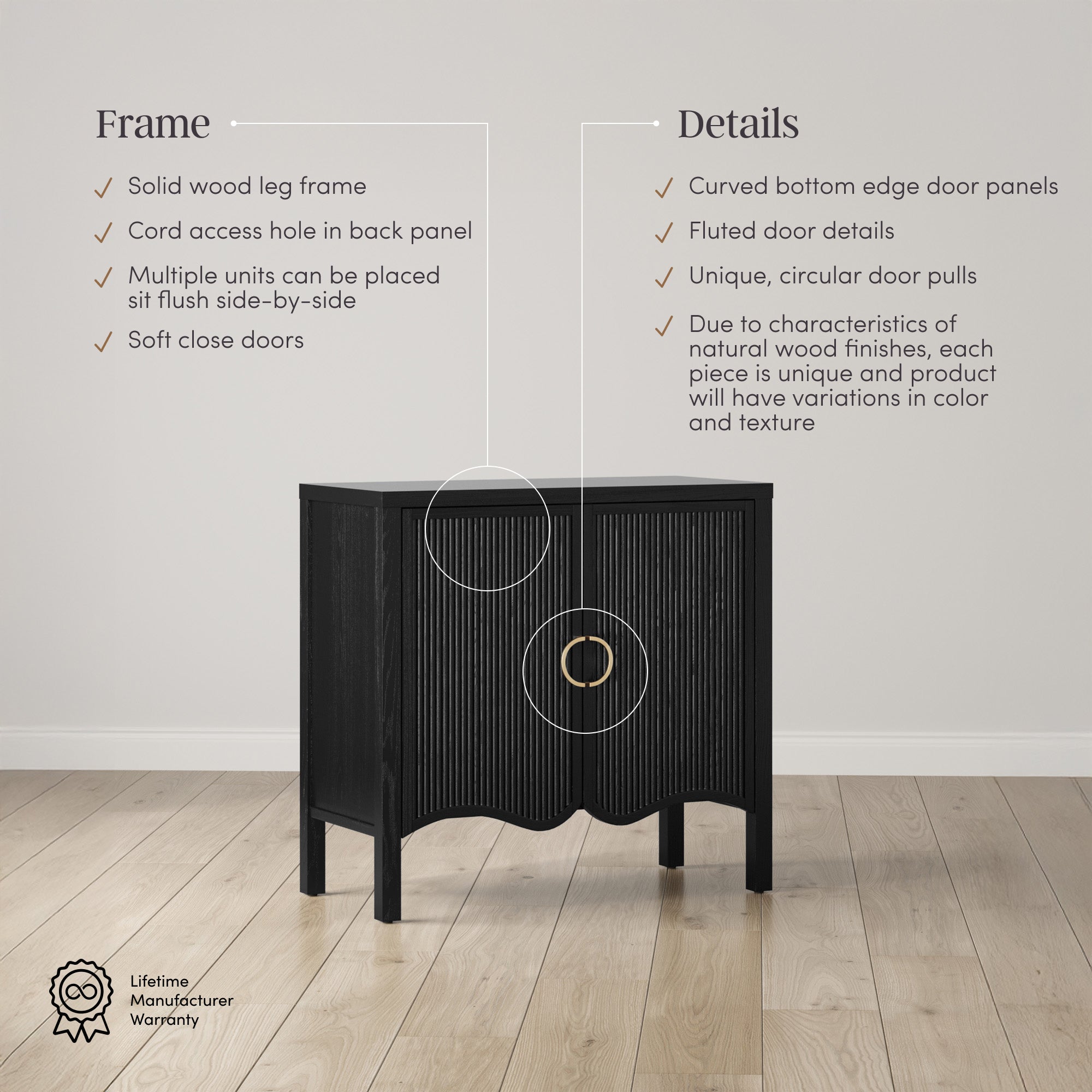 The Scott Storage Cabinet in black oak brings a warm, transitional charm to your space. Its fluted doors feature a unique curved edge and circular pulls for an elegant, modern touch. Soft-close doors and cord access in the back add everyday convenience, while the solid wood leg frame ensures lasting durability. Finished in real wood veneer, each cabinet showcases one-of-a-kind variations in color and texture‚ and you can place multiple units side-by-side for a seamless look.