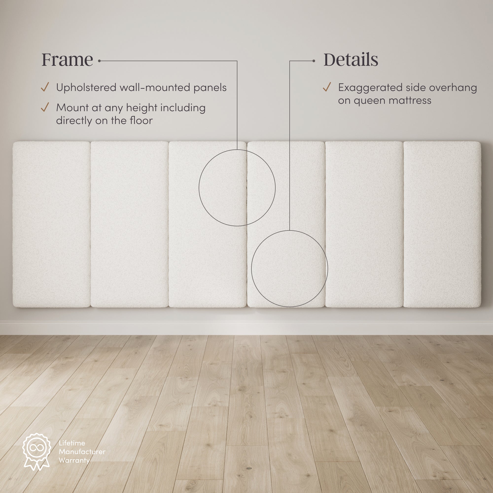 Elevate your bedroom with the Marissa Headboard, featuring wall-mounted panels upholstered in textured boucle for a cozy, mid-century modern look. Designed to mount at any height‚ including directly on the floor‚ Marissa offers flexible styling that fits your space. Made for a king bed, its extra-wide panels extend beyond each side for a dramatic overhang. Holstered panels make setup simple for a sleek, tailored upgrade to your bedroom.