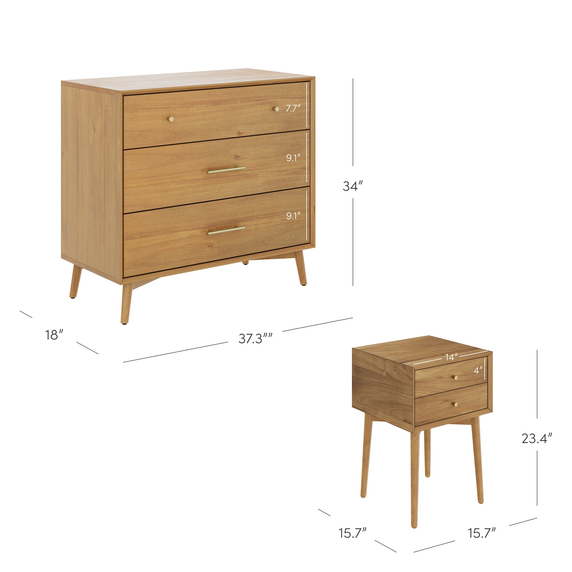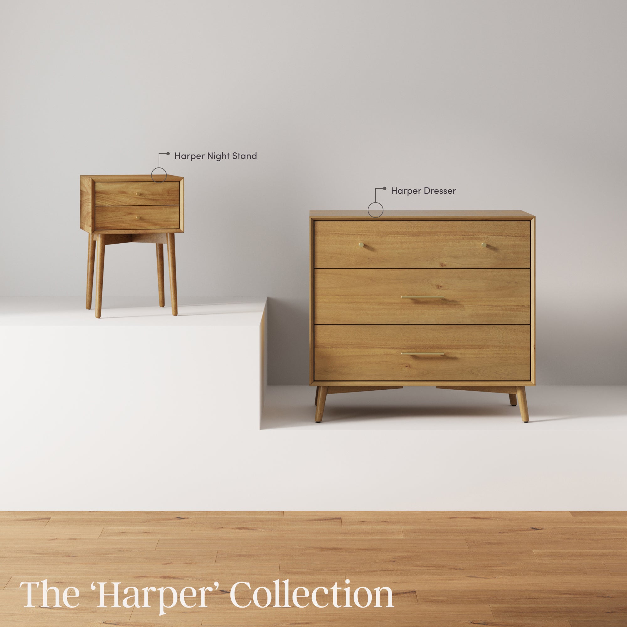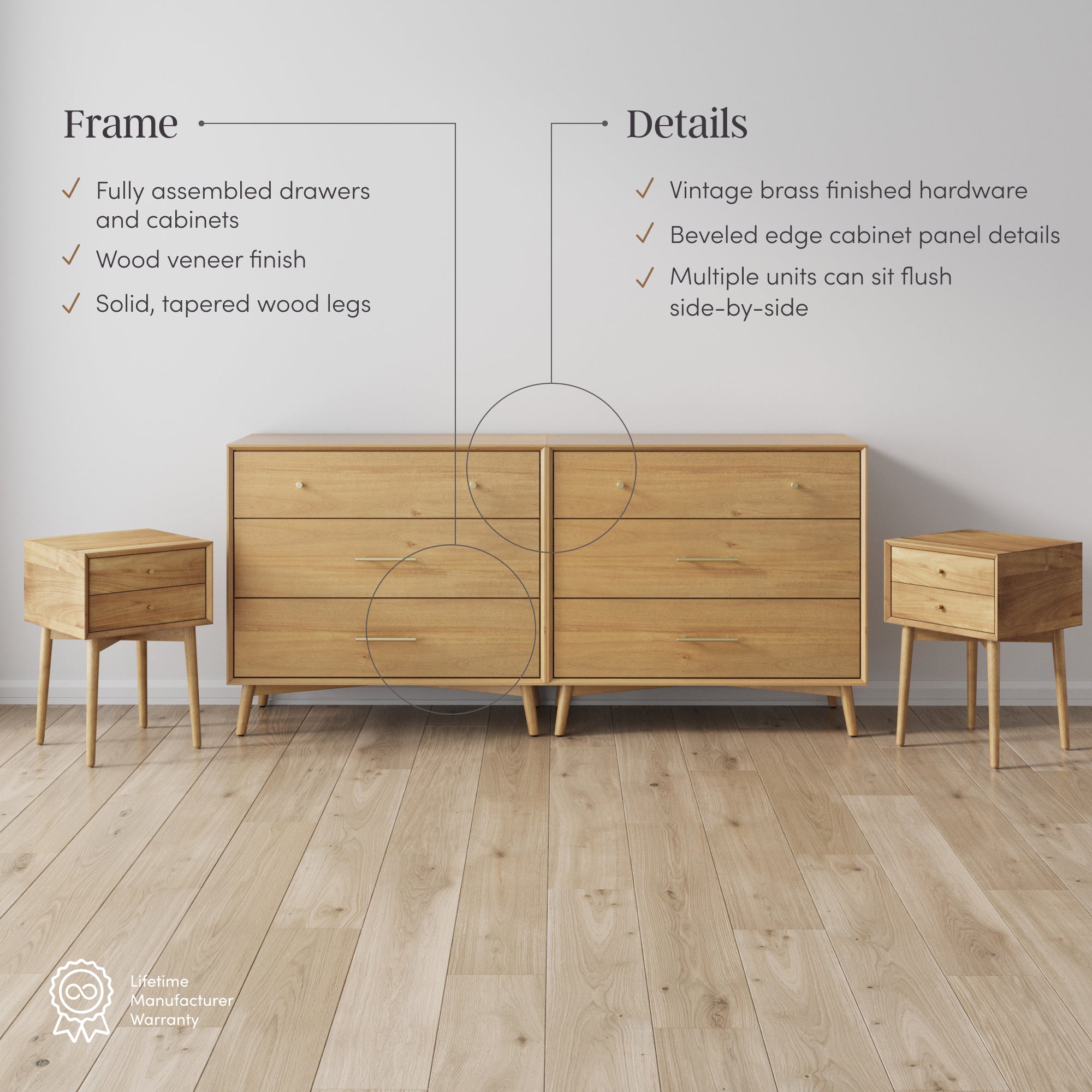 Meet the Harper Dresser and nightstand combo - a mid-century modern classic with effortless style and everyday function. Featuring beveled edge detailing and vintaged brass hardware, it’s the perfect blend of warmth and sophistication. The multiple cabinets sit flush side-by-side for a seamless look. The wood veneer finish and solid tapered legs are timeless, while natural wood variations make each piece truly one of a kind. Arrives with drawers fully assembled-just attach the legs and pulls, and you’re ready to go!