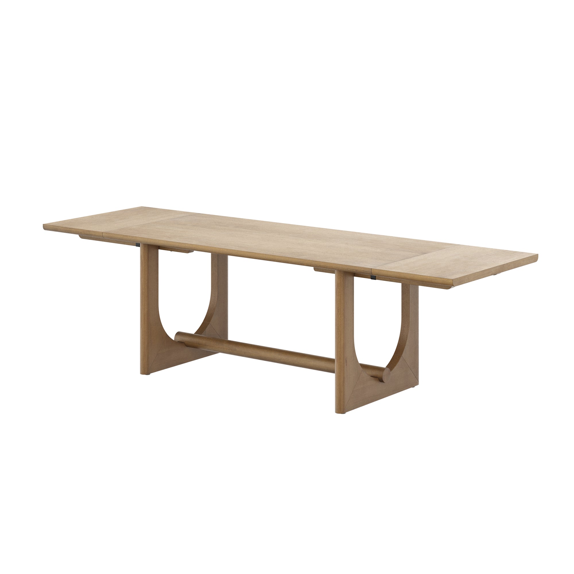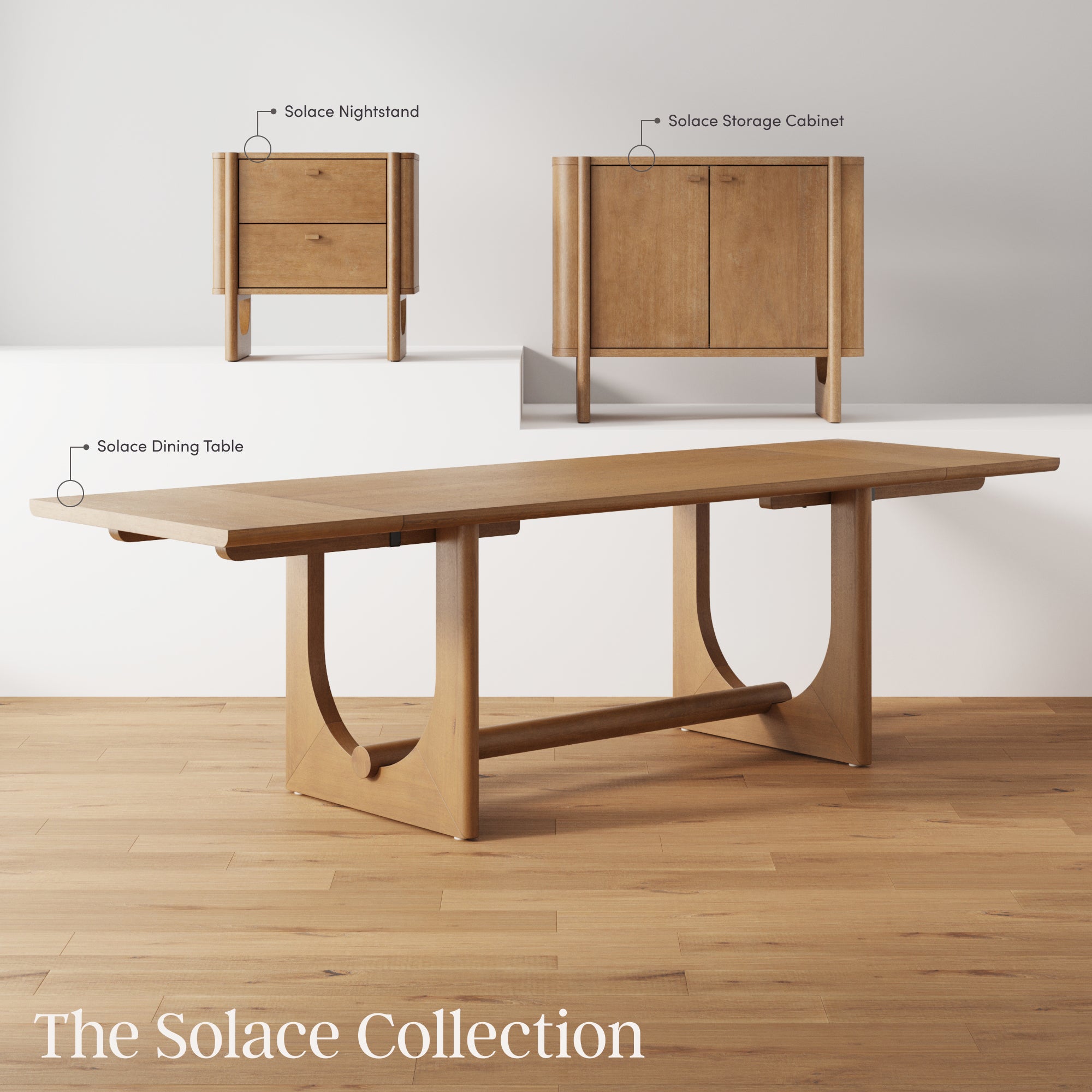 Gather in style around the Solace Extended Dining Table, where modern design meets timeless warmth. Crafted with a solid wood U-shaped base and a distinctive round bottom stretcher, it offers both strength and character. The thick tabletop features softly rounded edges and a smooth wood veneer finish. With extension leaves that seat up to eight, Solace is perfect for everything from everyday meals to special occasions.