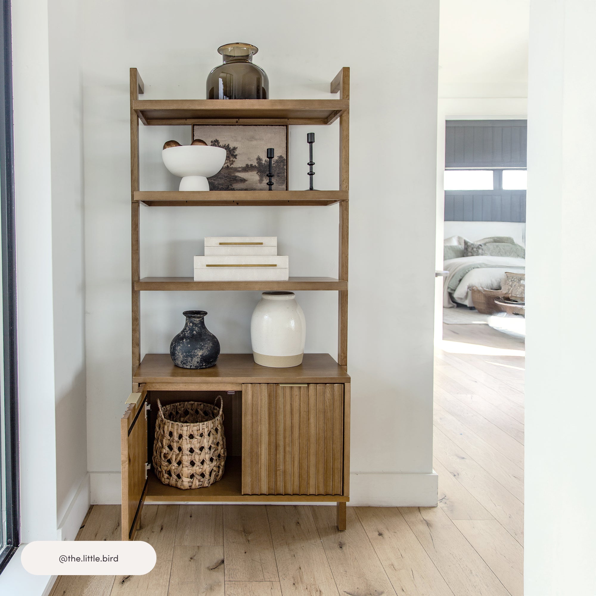Meet Jasper, a bookshelf with elegant fluted cabinet doors, rich wood grain, and brass-colored hardware. Built with solid wood doors, legs, and interior supports, it’s sturdy and stylish. Wall-secured for safety, Jasper adds a timeless touch to your space while keeping things organized!
