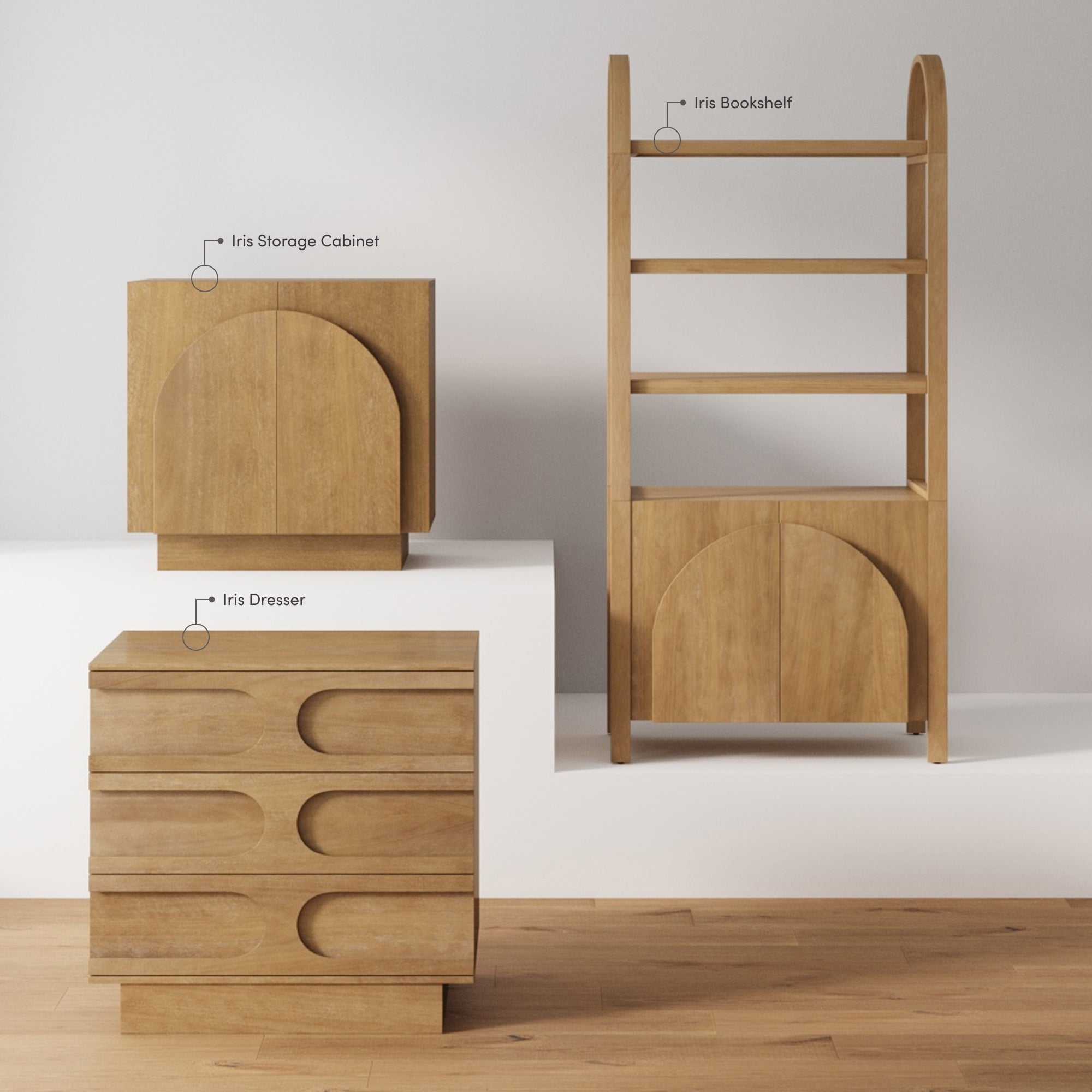 Meet our Iris Storage Cabinet! Inside, discover a handy closed storage shelf and ample storage space tucked behind its distinctive arched cabinet doors. The interior shelves are adjustable, allowing you to customize the storage to your needs. Crafted from wood, the natural material adds warmth to your space, though it's important to note that natural wood can have variations in wood grain, making each piece one-of-a-kind. Whether you place it in your bedroom, living room, or dining room, the Iris Storage Unit not only provides functionality but also enhances the overall ambiance of your living space with its elegant and calming design.