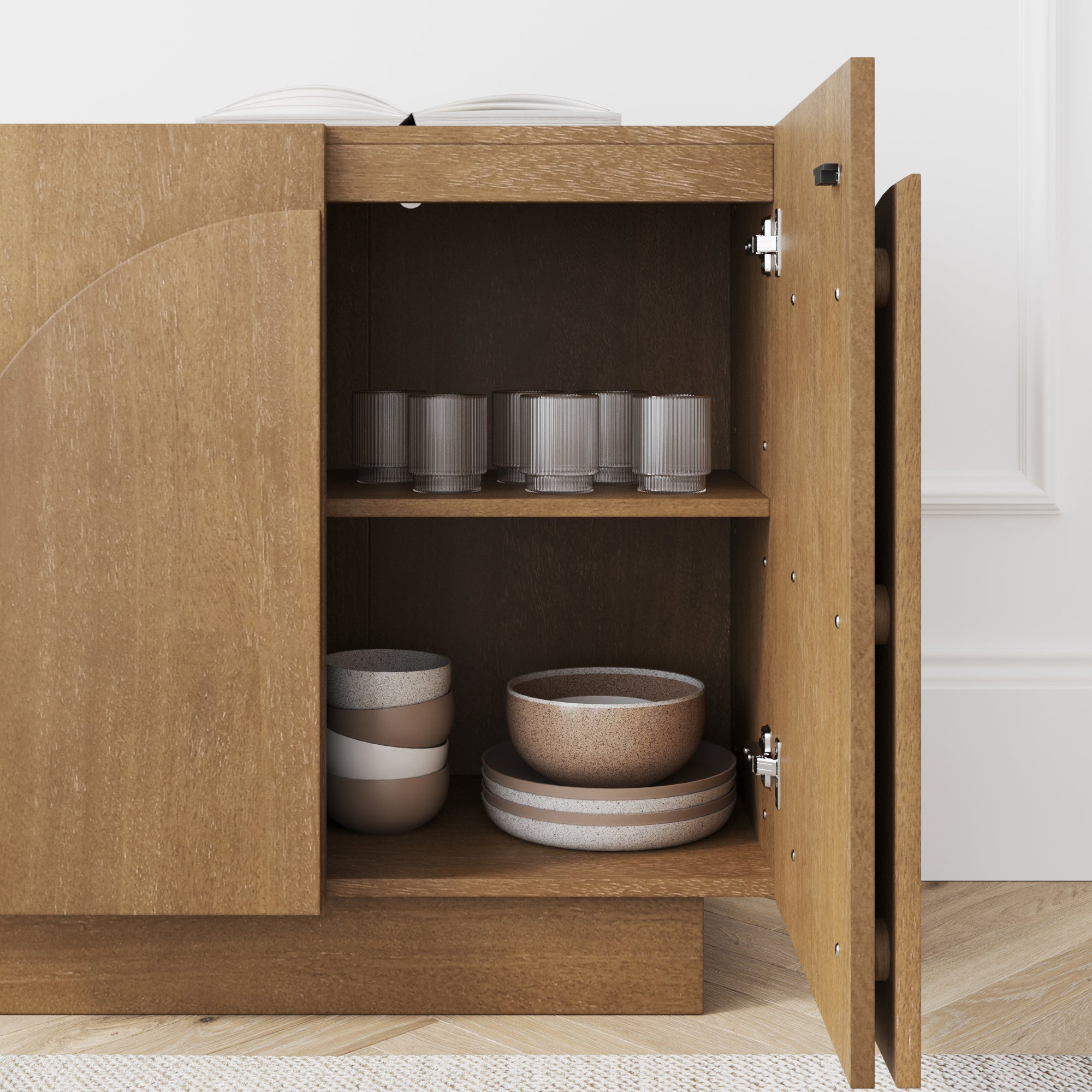 Meet our Iris Storage Cabinet! Inside, discover a handy closed storage shelf and ample storage space tucked behind its distinctive arched cabinet doors. The interior shelves are adjustable, allowing you to customize the storage to your needs. Crafted from wood, the natural material adds warmth to your space, though it's important to note that natural wood can have variations in wood grain, making each piece one-of-a-kind. Whether you place it in your bedroom, living room, or dining room, the Iris Storage Unit not only provides functionality but also enhances the overall ambiance of your living space with its elegant and calming design.