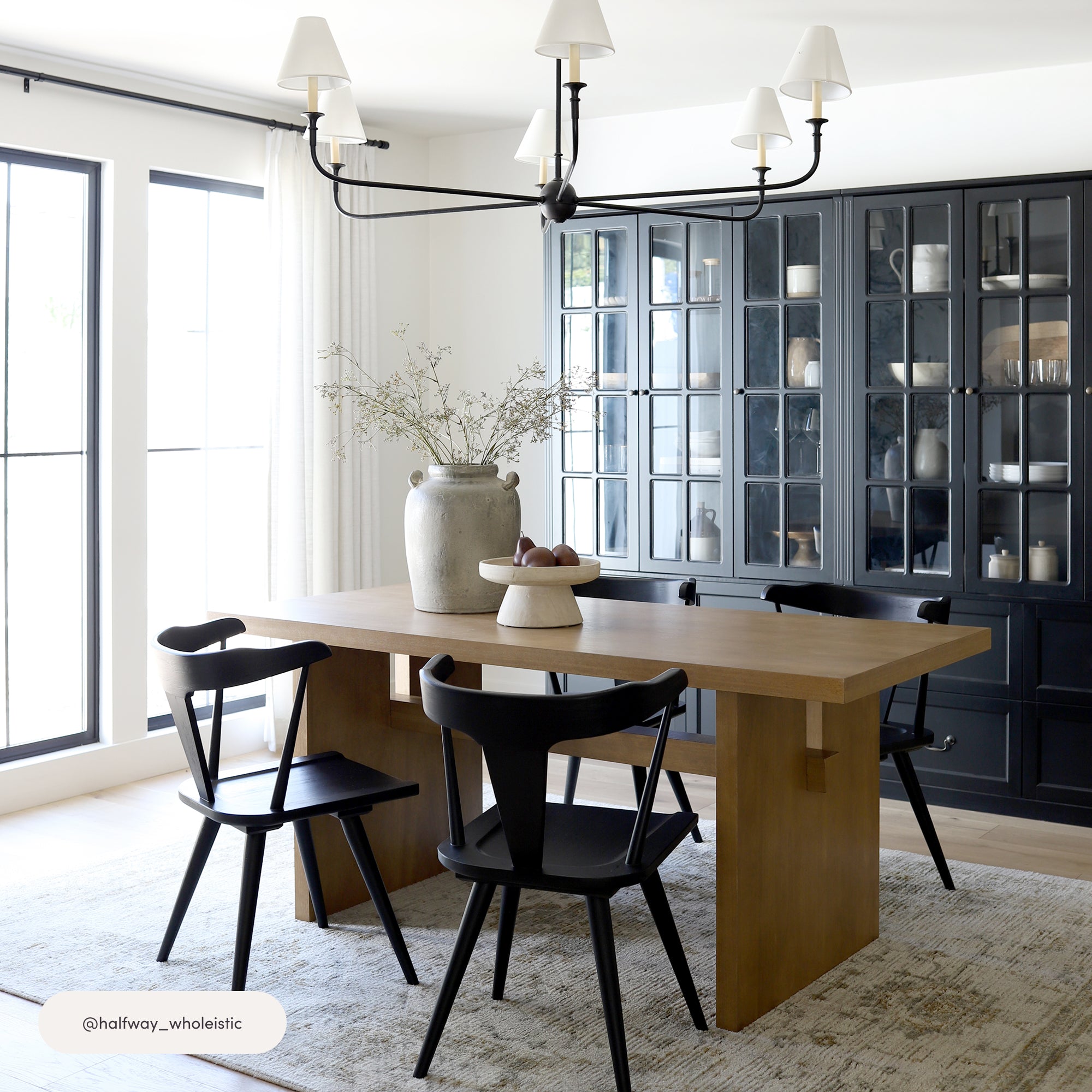 A modern dining room with a wooden table, four cushioned chairs, a sideboard with decor and drinks, pendant lights, framed art, and large windows with sheer curtains letting in natural light.