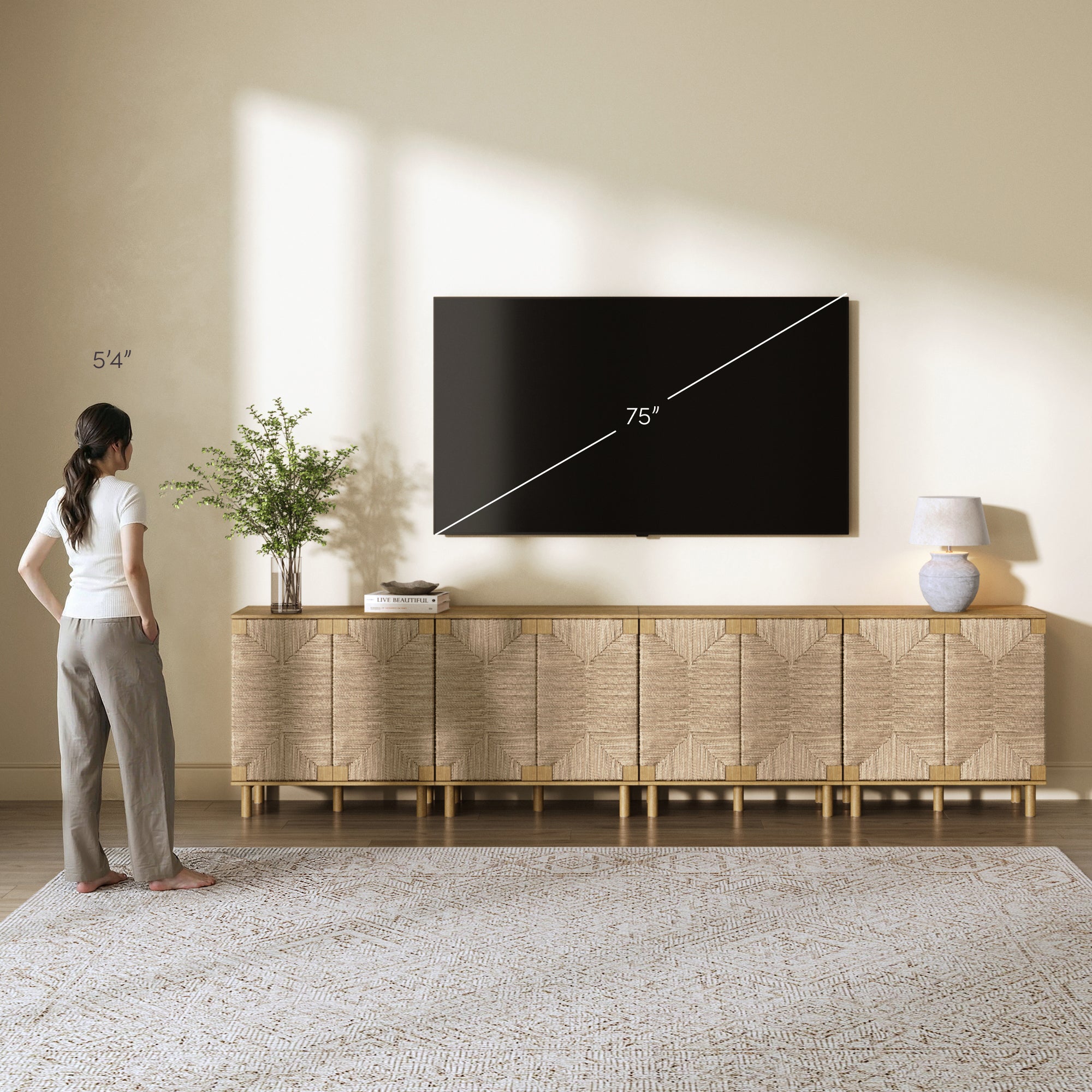 Meet Beacon—a TV console cabinet featuring natural seagrass doors, wood veneer, and solid wood legs. With push-latch doors, an adjustable shelf, and sturdy weight limits, it’s both stylish and functional. Each piece is uniquely crafted with natural wood and seagrass variations!