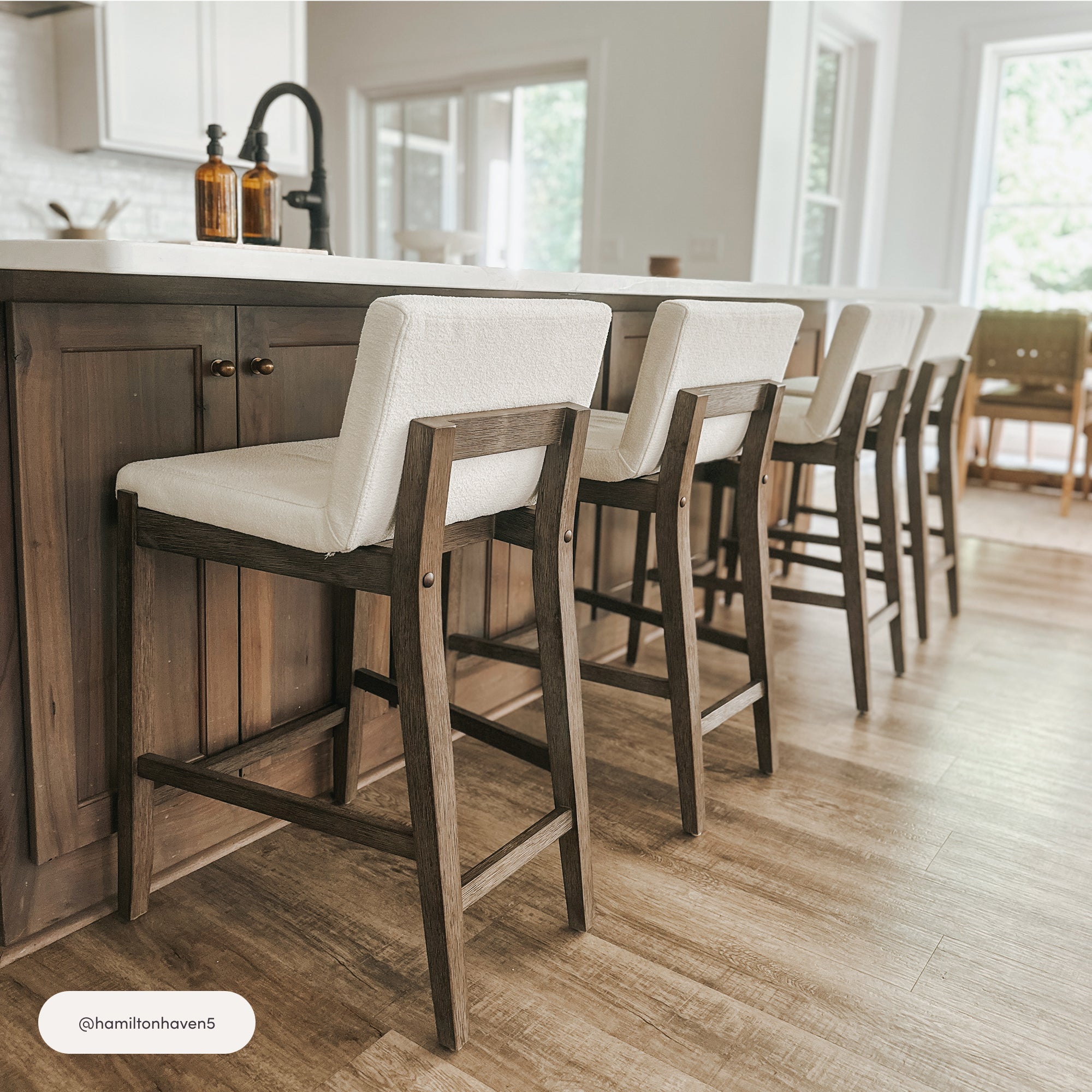 Kick your feet up in style with our Gracie bar stool. With an exposed wood back and sleek modern design, Gracie is sure to stun. This bar stool combines a wire brushed dark brown wood finish and a cream boucle cushion for ultimate comfort and style. It boasts a modern silhouette with tapered legs and a curved seat, making this bar stool the star of any kitchen. So grab your drink of choice and sit back in full comfort on these made-to-last bar stools.