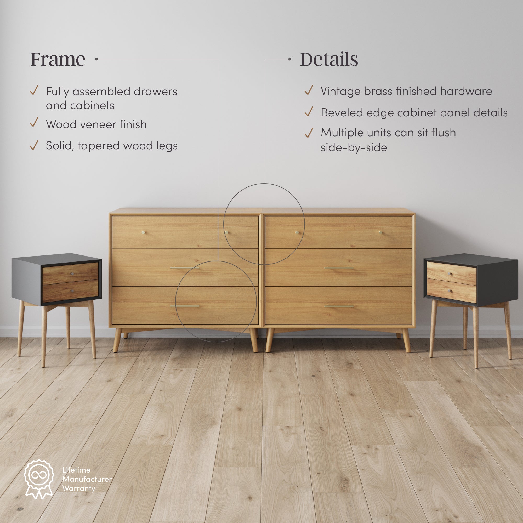 Meet the Harper Dresser - a mid-century modern classic with effortless style and everyday function. Featuring three spacious drawers with beveled edge detailing and vintaged brass hardware, it’s the perfect blend of warmth and sophistication. The multiple cabinets sit flush side-by-side for a seamless look. The wood veneer finish and solid tapered legs are timeless, bold black paint adds a pop of contrast, while natural wood variations make each piece truly one of a kind. Arrives with drawers fully assembled-just attach the legs and pulls, and you’re ready to go!