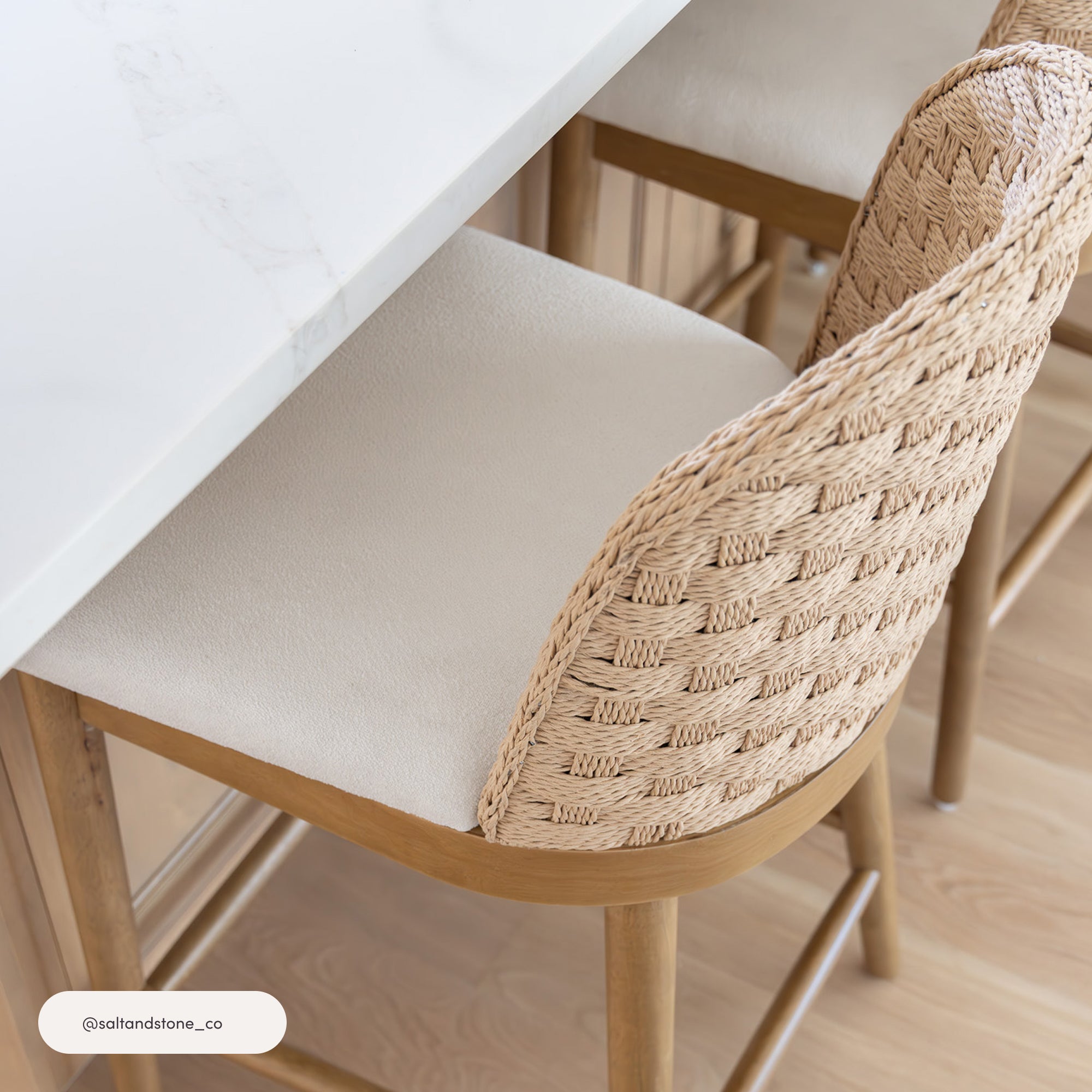 Say hello to the Rikki Counter Stool, where laid-back boho style meets everyday comfort. With a solid wood frame and a beautifully woven faux seagrass back, It's the perfect blend of durability and breezy charm. The curved backrest keeps things comfy, while the natural wood grain ensures that each piece is one of a kind. Whether you're sipping morning coffee or hosting happy hour, Rikki brings warmth, texture, and effortless style to your space!